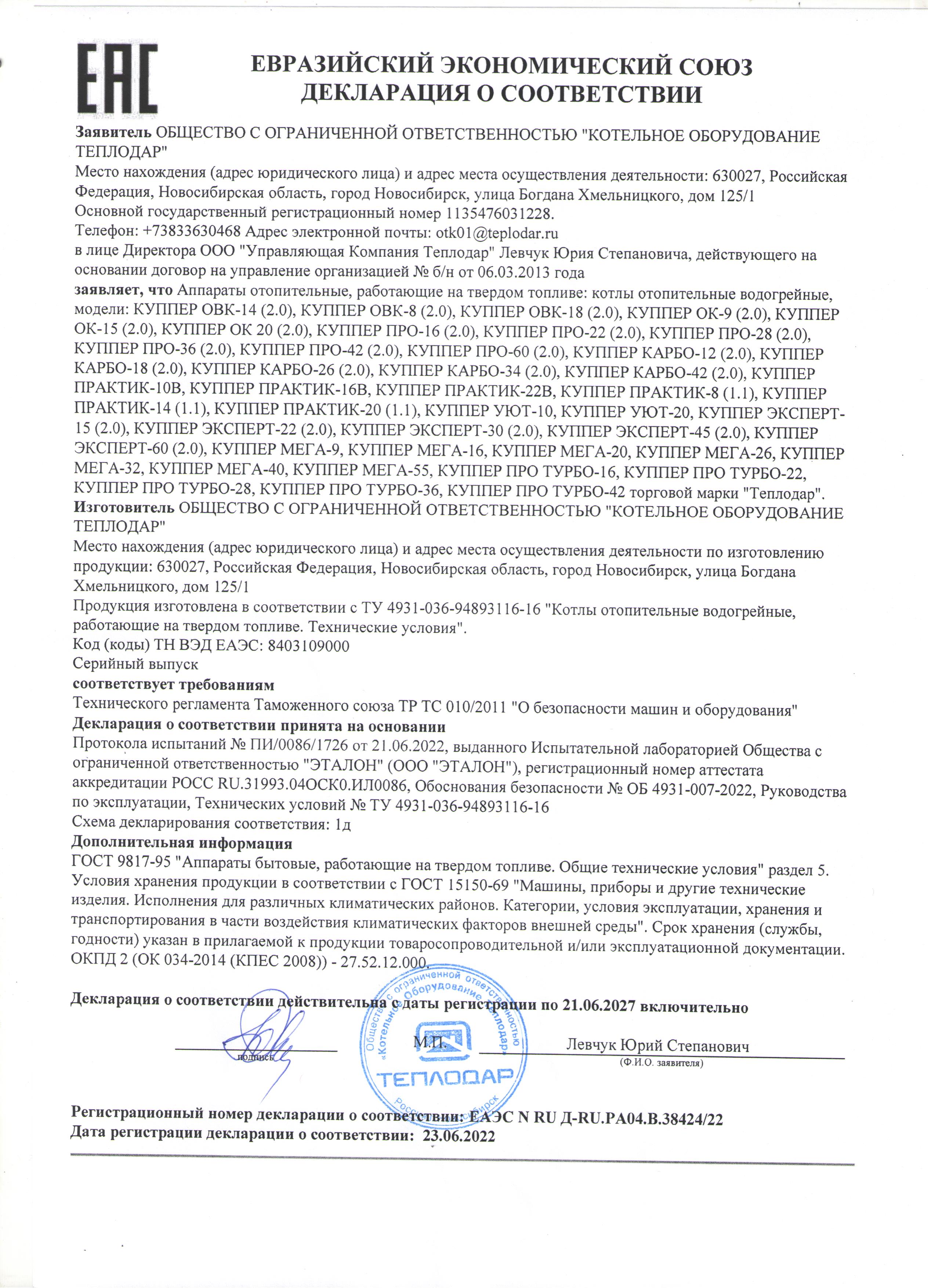 Комплект | Твердотопливная серия котлов отопления с увеличенным объемом топки Купер ПРО имеет в своем составе 5 моделей мощностью от 16 до 42 кВт, что дает возможность обогревать частные дома или дачи площадью до 420 м². Универсальность стальных котлов Теплодар позв |